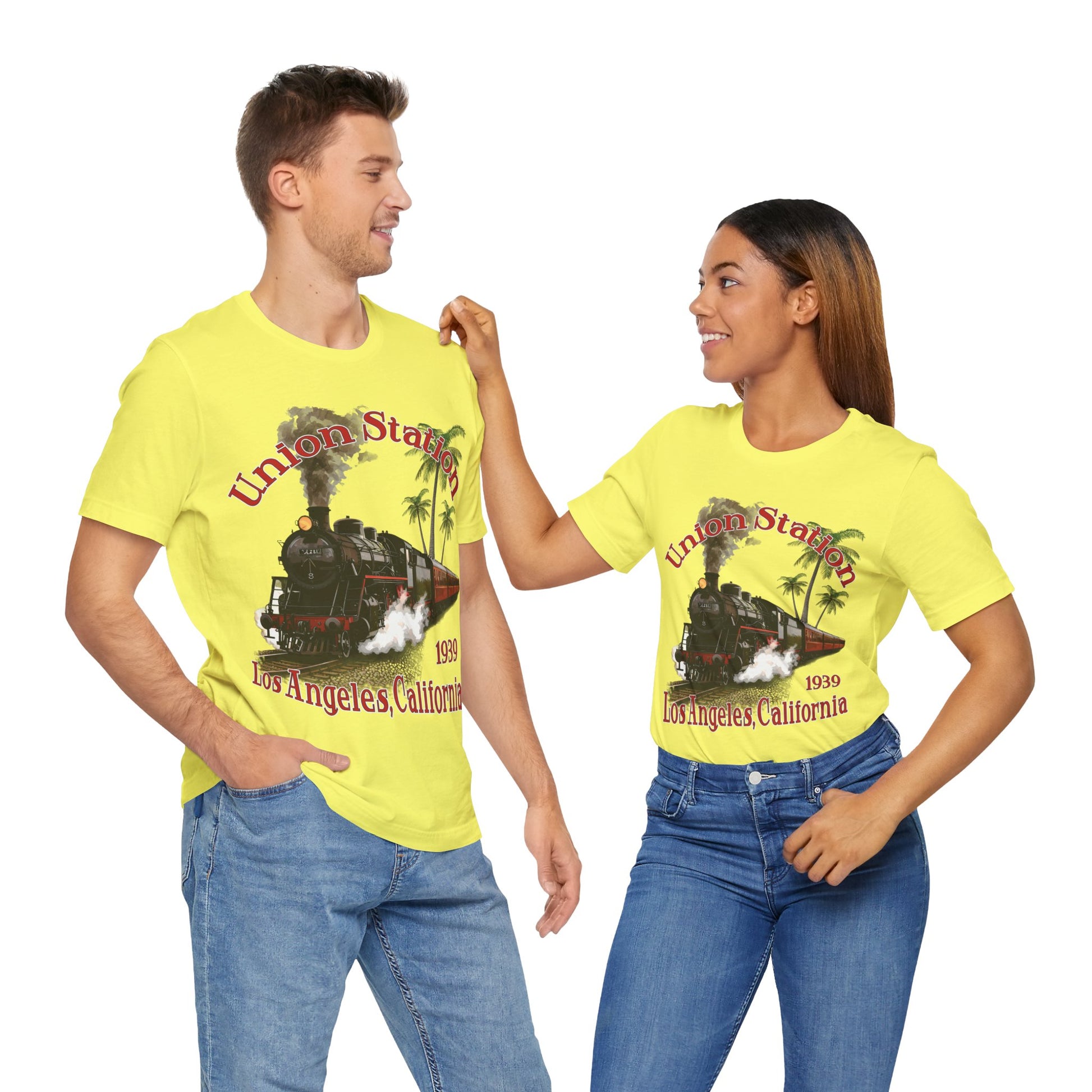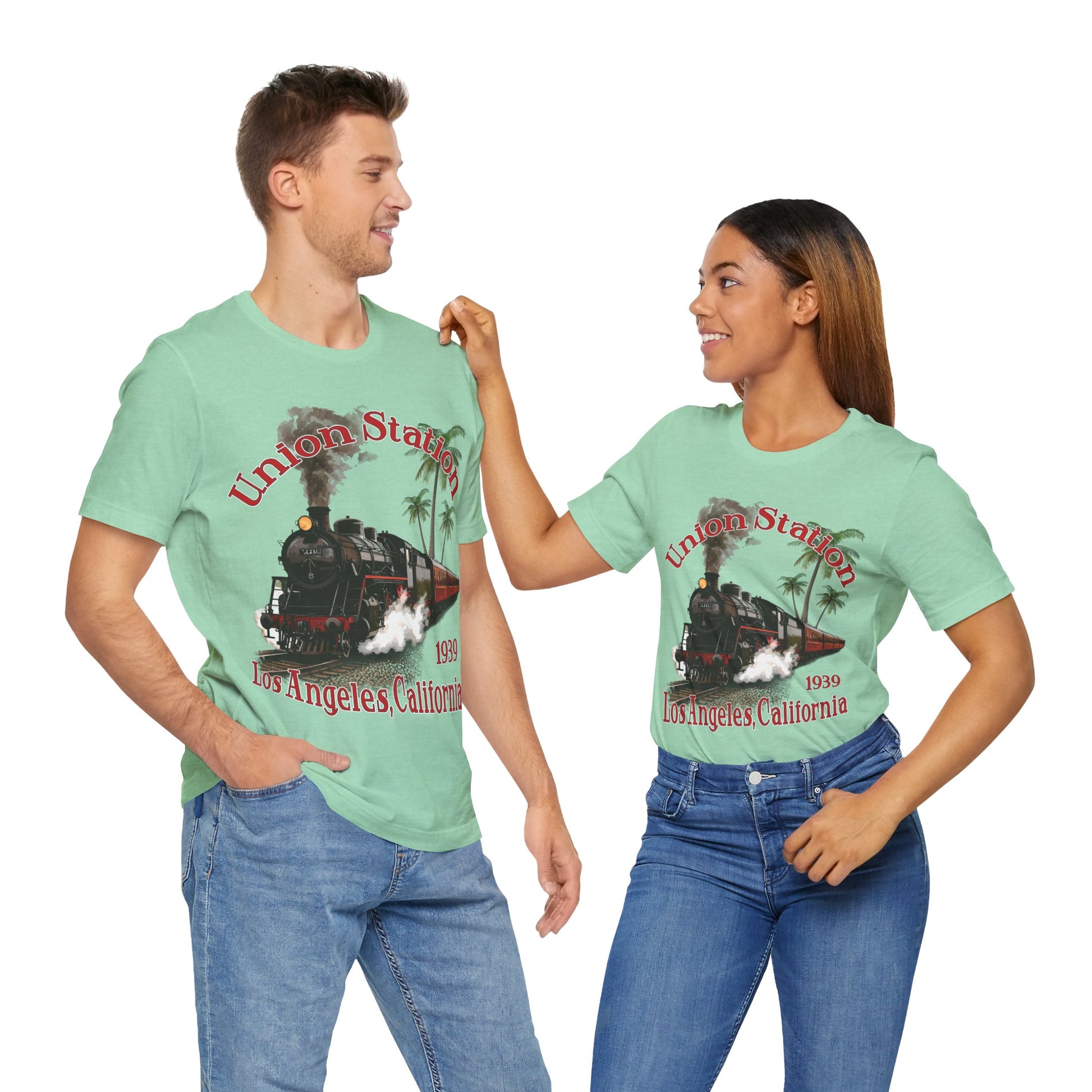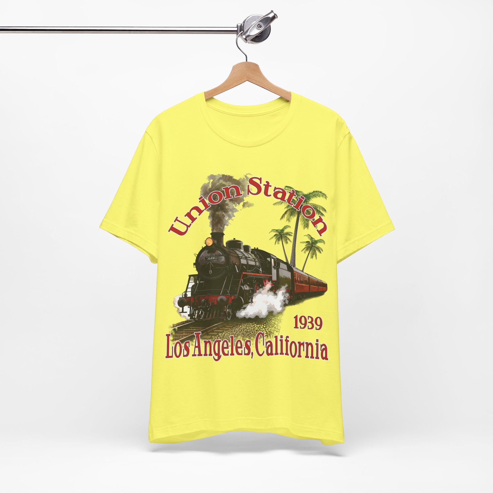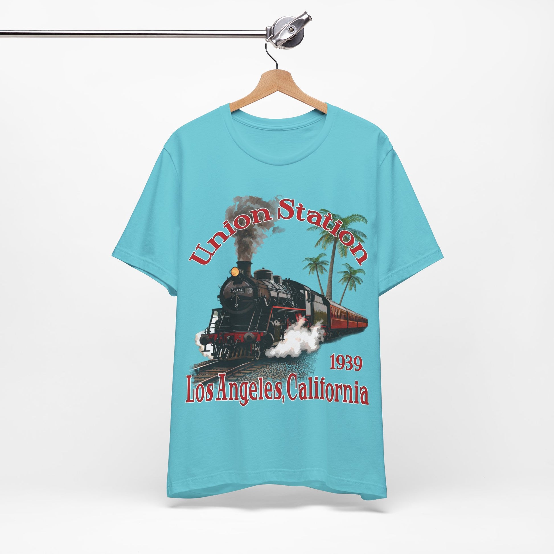 Transport yourself back to historic Los Angeles Union Station, opened in 1939 with this shirt featuring a classic steam locomotive. Perfect for train enthusiasts and those who appreciate vintage history. Ideal for casual wear and a great gift for train buffs or those who love California landmarks. Relevant for travel-themed events or train-related celebrations.